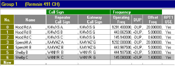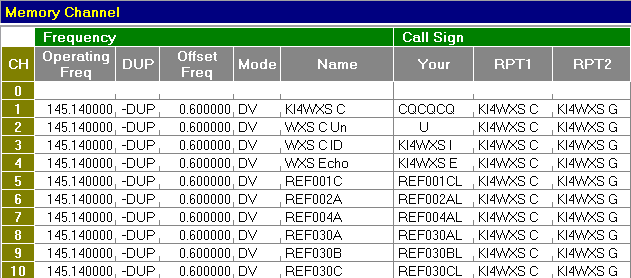 This memory organization creates a group of adjacent memory channels for use on one repeater. In this example, KI4WXS, module C (VHF) is used. Its frequency, shift, offset, RPT1 and RPT2 are the same for each memory. The UR entry is what differentiates the desired D-STAR command. These are described below. Channel 1 – This is used for general QSOs on this repeater. CQCQCQ is in the UR field. CQCQCQ means that your transmission will be directed to no one in particular. If the repeater is already linked to another repeater or reflector, you will transmit on both your local repeater and on the linked repeaters and reflectors. Channel 2 – This is used to issue an UNLINK command to the repeater. (There are 7 blanks before the U so the U is in the eighth position.) To unlink the repeater, tune to this channel and momentarily key your radio. A voice reply will announce that the repeater is now unlinked. Return to channel 1 to use the repeater unlinked. Channel 3 – This is used to determine if the repeater is linked. To use, tune to Channel 3 and momentarily key your radio. If the repeater is linked, a voice will announce “Remote System Linked”. The linked repeater or reflector ID will scroll across the radio’s data display. If the repeater is not linked, the voice will announce the repeater call sign and the radio’s data display will scroll the repeater call sign. Be sure to return to Channel 1 to continue. Channels 4 - This provides a method for the repeater to record your transmission and play it back. This can be useful to see how well you are getting into the repeater. To use, tune to Channel 4 and make a short voice transmission. After you un-key, your transmission will be played back (echoed) over the repeater. When finished, be sure to tune to Channel 1 for normal operation. Channel 5 – 10 – These are used to issue a link command to your favorite repeater or reflector. For example, to link the repeater to REFLECTOR 1C, tune to Channel 5, and momentarily key the radio when clear. Upon successful linking, a voice will announce “Remote System Linked” and the linked status will scroll on the radio’s data display. Be sure to return to Channel 1 to continue. Alternate programming method for certain ICOM radios with the DR mode The method described on the other page can be used on all ICOM radios, but consumes many memory slots. If you have one of the ICOM radios (IC-80AD, IC-9100, ID-31A, ID-880H) with the DR (D-Star Repeater) mode you can use the method described below. This uses fewer memories and makes it easy to scan just the local D-Star repeaters when the radio is in the DR mode. The radio has separate memories for a Repeater List and a Call Sign List. The table below shows 5 memory channels taken up by the D-Star Charlotte area repeaters. These are in the radio’s Repeater List.
